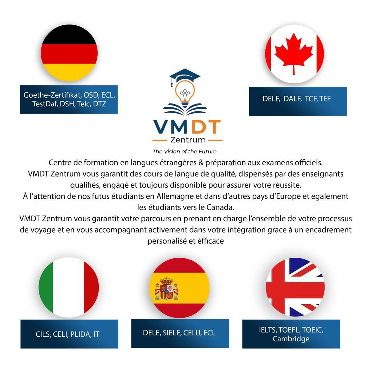 VMDT Zentrum vous garantit votre parcours en prenant en charge l'ensemble de votre processus de voyage et en vous accompagnant activement dans votre integration grace a un encardrement personalisé et efficace. Nous vous préparons aux certifications linguistiques internationales reconnues pour :